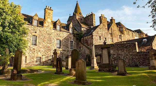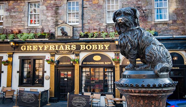 Najpierw wchodzimy na teren cmentarza Greyfriars Kirkyard. Cmentarz funkcjonuje od końca XVI w. Znajdują się tu groby wielu wybitnych mieszkańców miasta. Jego nazwa, jak i zresztą pobliskiego kościoła, pochodzi od Franciszkanów. Cmentarz jest powiązany z historią Bobby'ego - psa, który strzegł wiernie grobu swojego pana przez 13 lat. Naprzeciw bramy cmentarza można zresztą zobaczyć pomnik słynnego psa. Co ciekawe, mimo położenia w centrum miasta, jest tutaj bardzo cicho i spokojnie. Kościół Greyfriars pochodzi z XVI w.