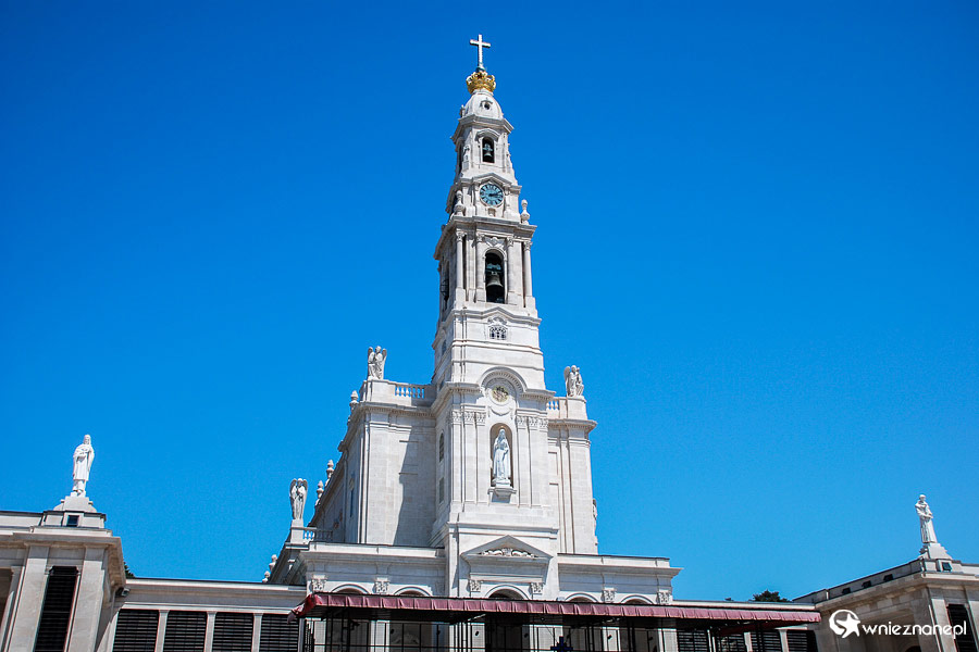 Fatima. Bazylika Matki Boskiej Różańcowej. Wieża dzwonnicza wznosi się na 65 metrów wysokości.