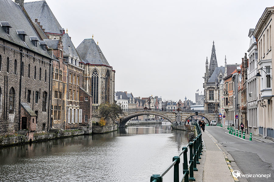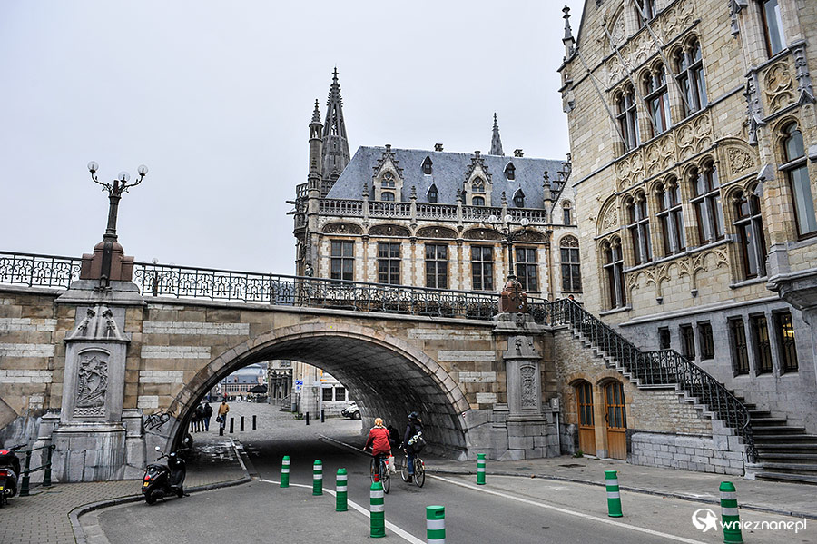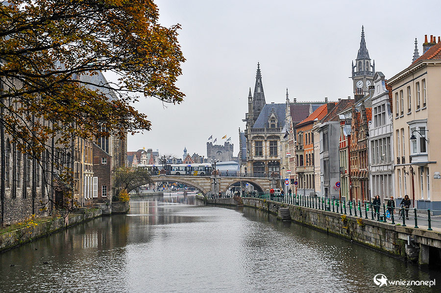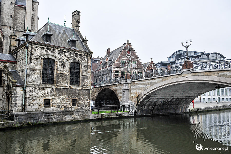 Gandawa (Gent). Efektowne fasady domów obok Sint Michielsbrug (Mostu św. Michała).