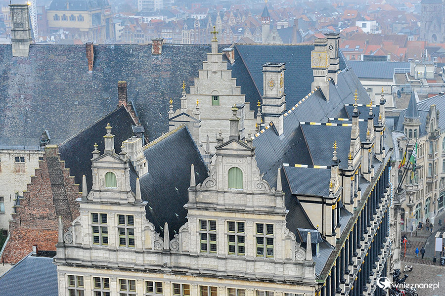 Gandawa (Gent). Widok z dzwonnicy (Belfort en Lakenhalle) na miasto. Z lewej renesansowa fasada ratusza (Stadhuis).