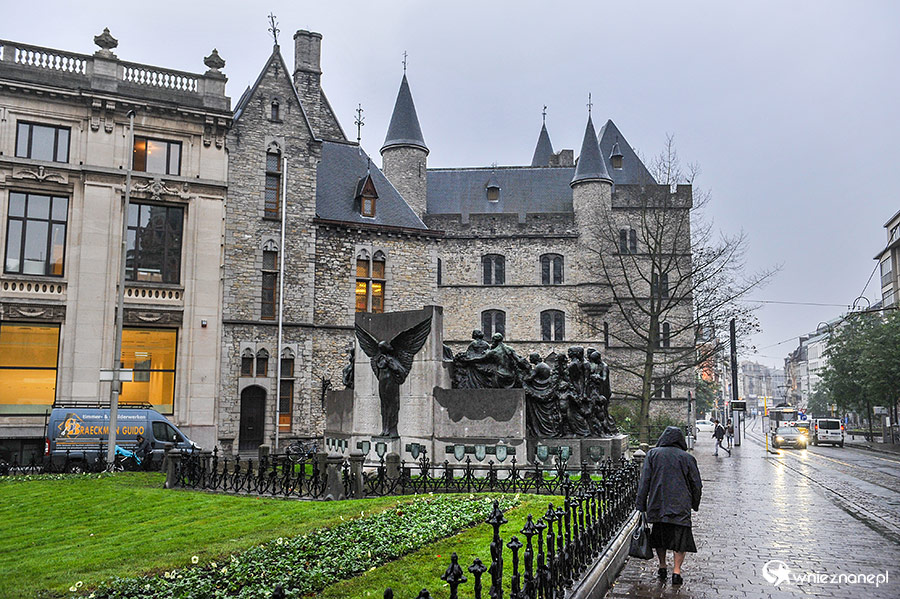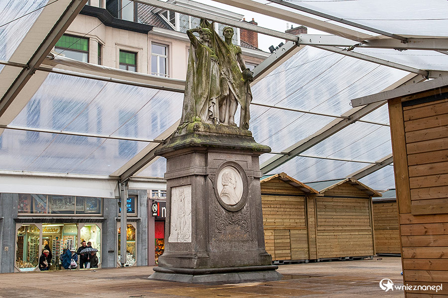 Gandawa (Gent). Pomnik na placu pomiędzy dzwonnicą i Sint Niklaaskerk. Trwają przygotowania do jarmarku świątecznego.