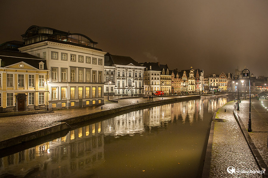 Gandawa (Gent) nocą. Widok na ulice Korenlei i Graslei.