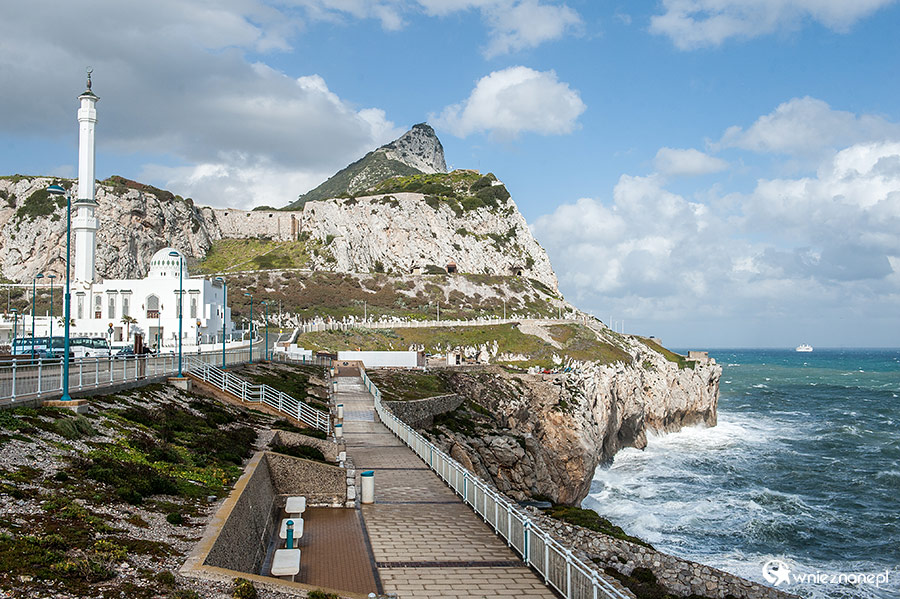 Gibraltar. Widok z Europa Point na Morze Śródziemne i Upper Rock. Z lewej biała bryła Meczetu Ibrahima al-Ibrahima.