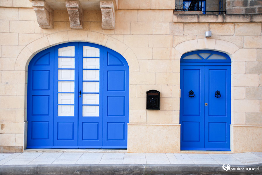 Gozo. Nadur. Silnie i pięknie kontrastujące drzwi na tle piaskowej fasady jednego z domów.
