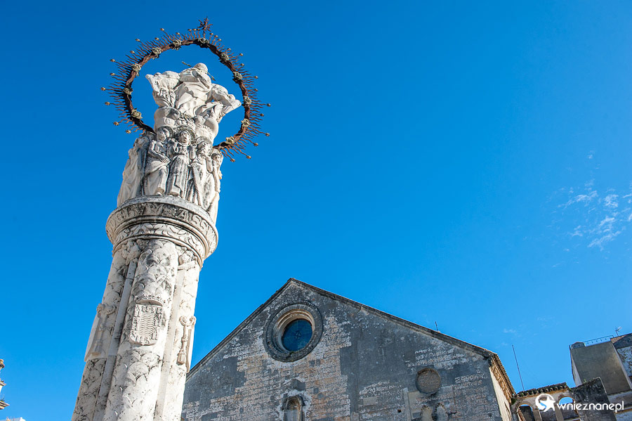 Jerez de la Frontera. Pomnik La Asuncion, czyli Pomnik Wniebowzięcia na Plaza de la Asuncion. W tle Iglesia de San Dionisio.