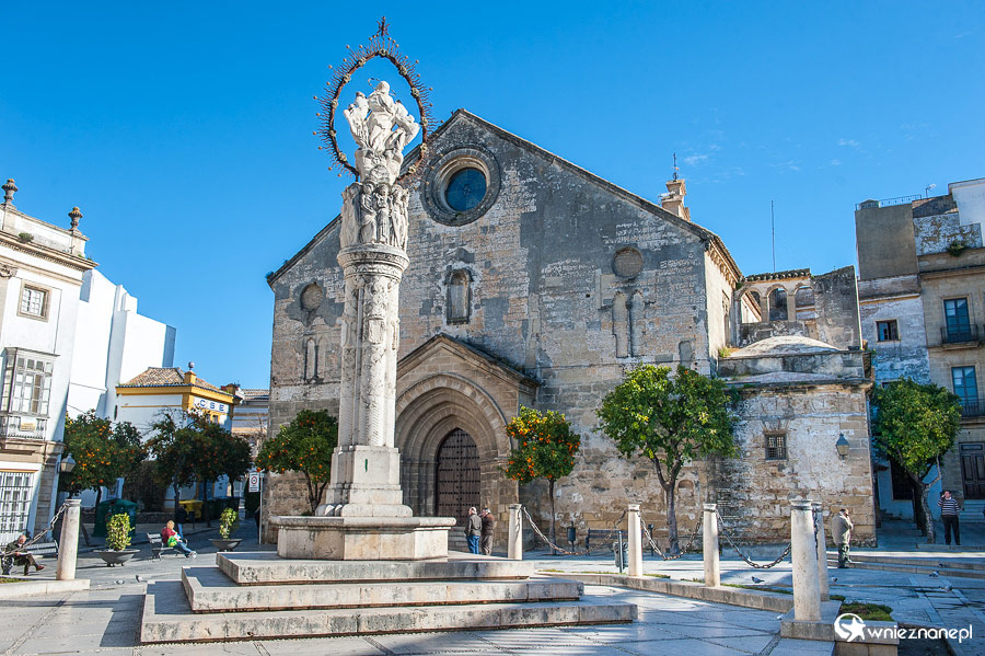 Jerez de la Frontera. Pomnik La Asuncion i Iglesia de San Dionisio na Plaza de la Asuncion.
