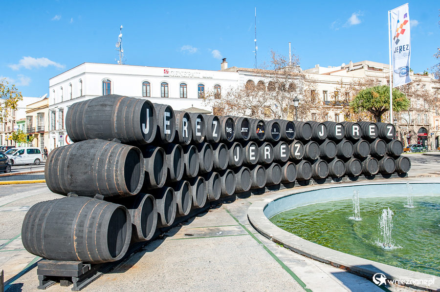Jerez de la Frontera. Beczki przy Plaza del Mamelon przypominają o winiarskich tradycjach miasta.