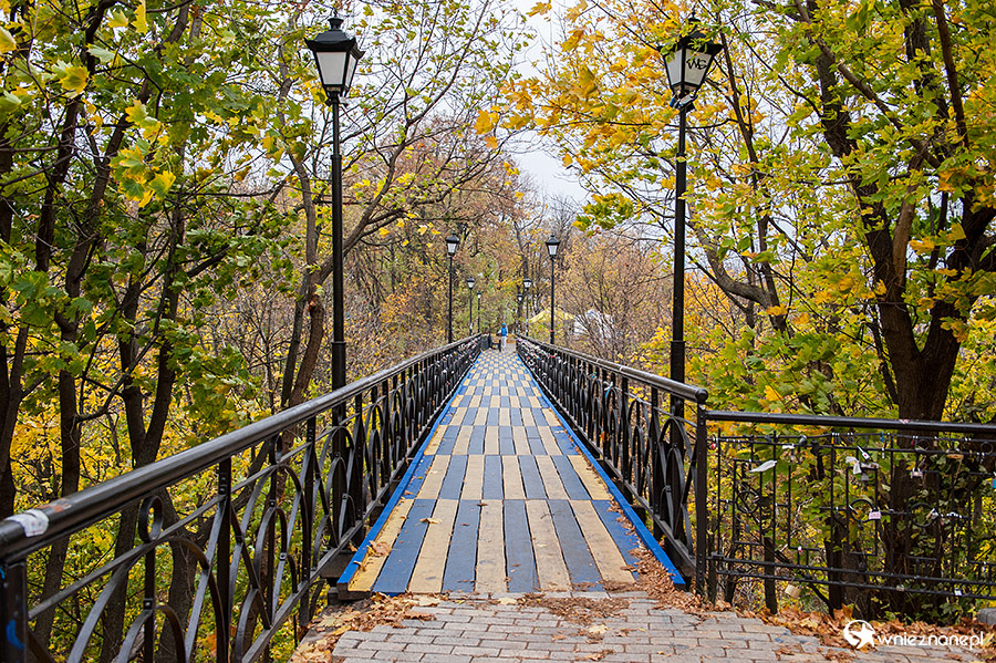 Kijów. Romantyczny mostek z drewnianych, uginających się desek w Parku Maryjskim.