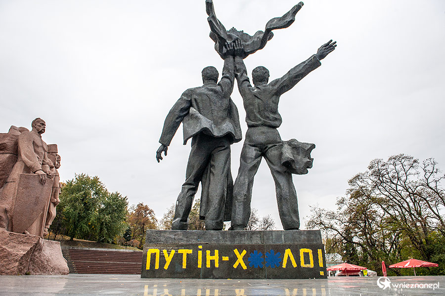 Kijów. Obraźliwe hasło w kierunku Władimira Putina na Pomniku Przyjaźni Narodów.