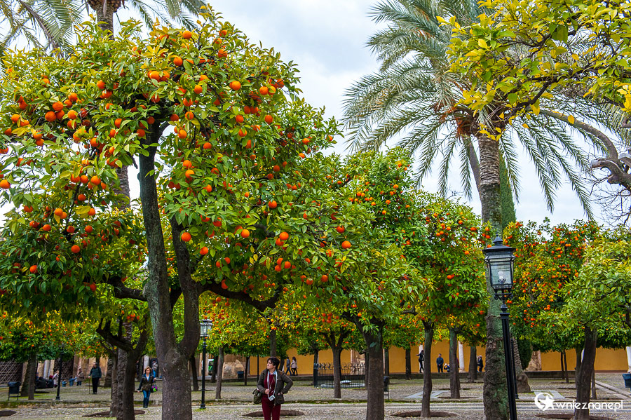 Kordoba. Drzewka pomarańczowe i palmy niedaleko katedry.