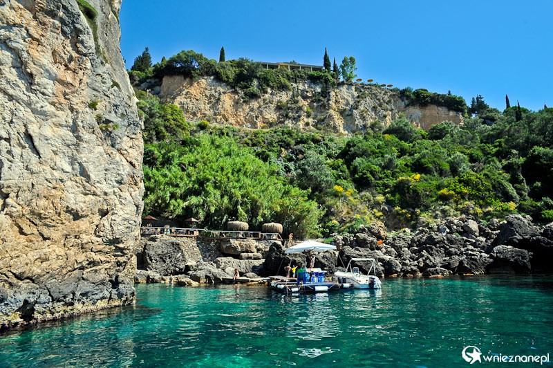 Grecka wyspa Korfu. Skaliste wybrzeże Morza Jońskiego  w miejscowości Paleokastritsa. La Grotta widziana od strony morza.  - foto: wnieznane.pl