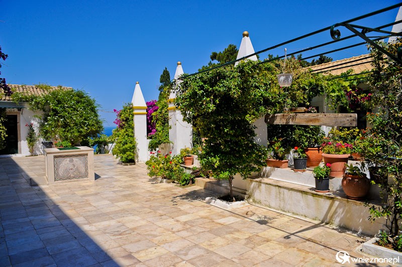 Grecka wyspa Korfu. Ukwiecony teren monastyru Theotokou w miejscowości Paleokastritsa.