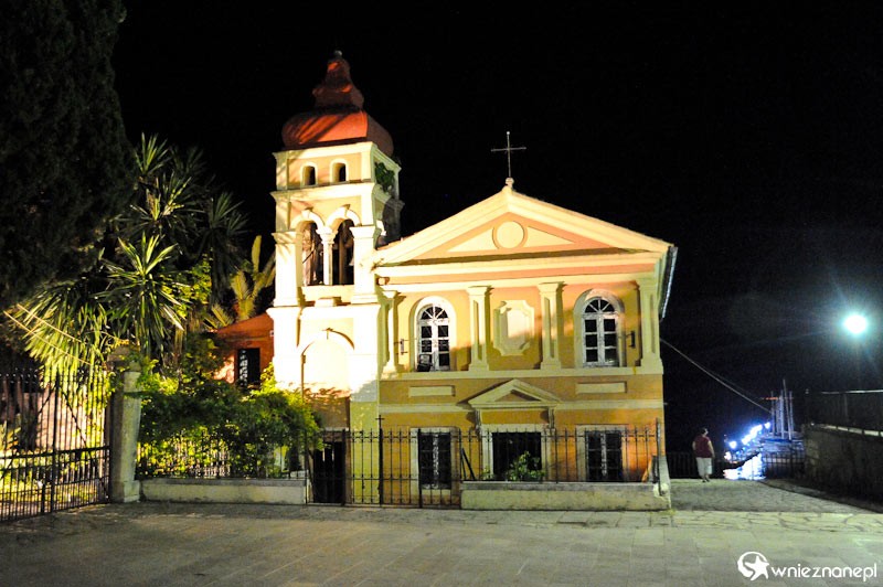 Grecka wyspa Korfu. Stolica wyspy, Kerkira nocą. Kościół Panagia Mandrakina.