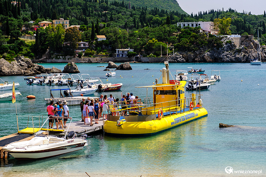 Korfu. Żółta łódź podwodna i łódki w porcie w miejscowości Paleokastritsa.
