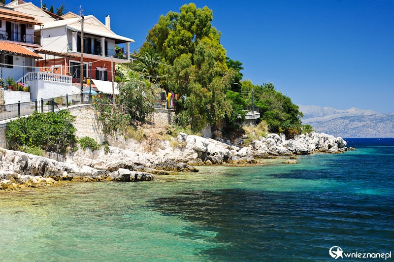Grecka wyspa Korfu. Miasteczko Kassiopi i przepiękna krystaliczna woda. W tle Albania.