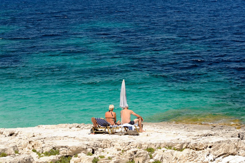 Grecka wyspa Korfu. Przepiękne skaliste wybrzeże i fantastyczna woda w okolicach Kassiopi. Ludzie wypoczywający na tle wielkiego błękitu.