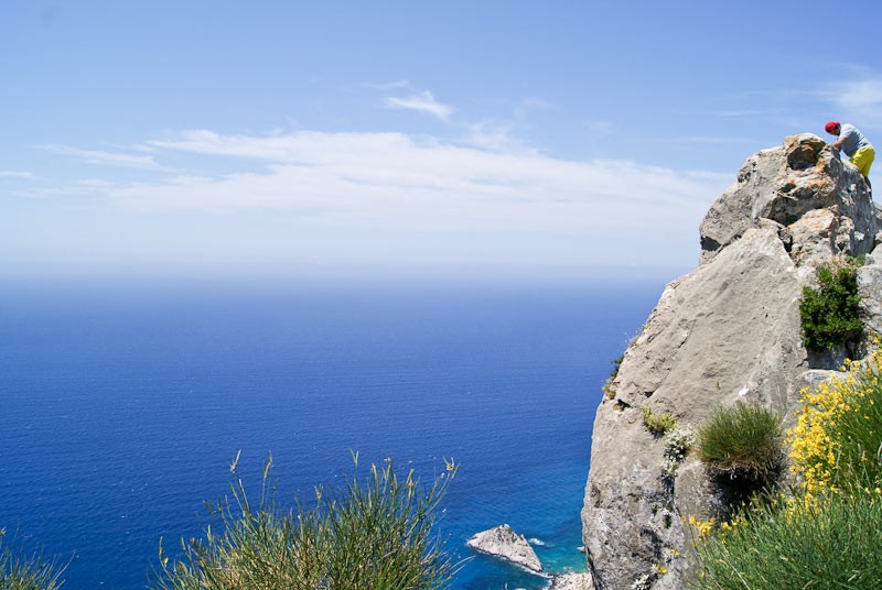 Grecka wyspa Korfu. Człowiek wdrapujący się na skałę. W dole Morze Jońskie.