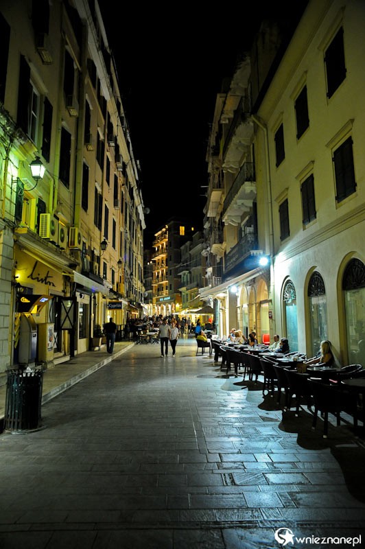 Grecka wyspa Korfu. Oświetlone nocą wąskie uliczki stolicy wyspy - Kerkiry.