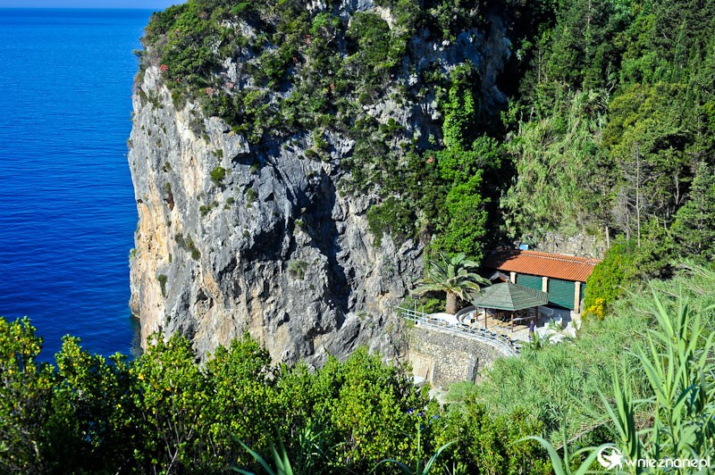 Grecka wyspa Korfu. Restauracja ukryta wśród skał, tuż nad brzegiem morza w Paleokastritsie.