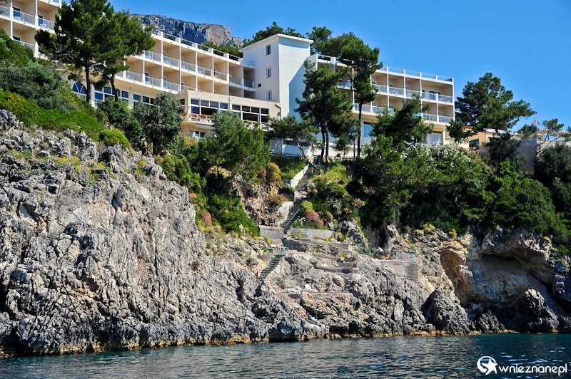 Grecka wyspa Korfu. Schodki i drabinka prowadzące z jednego z hoteli w Paleokastritsie do wody. - foto: wnieznane.pl