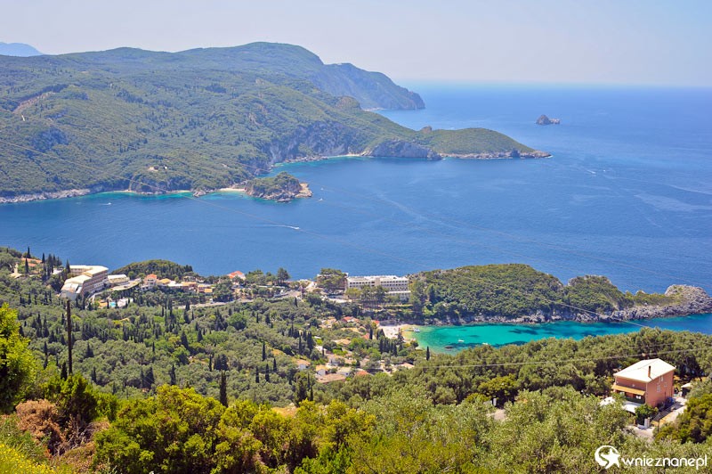 Grecka wyspa Korfu. Widok na Paleokastritsę z ruin zamku Angelokastro.