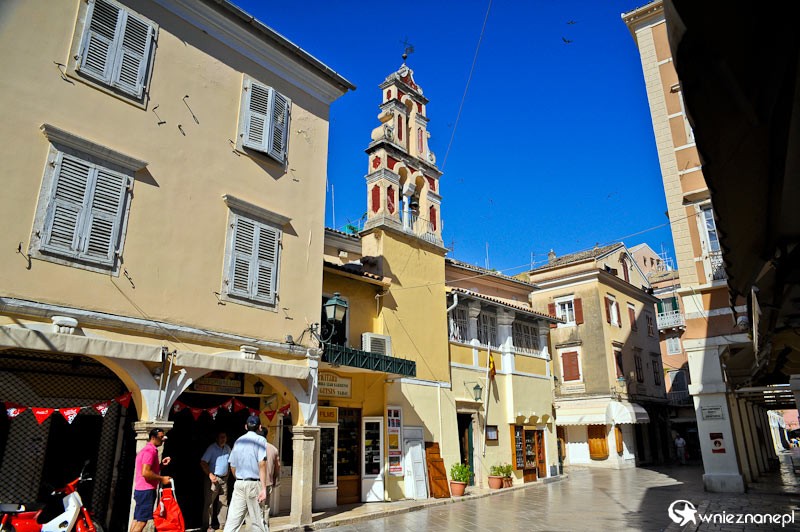 Grecka wyspa Korfu. Tradycyjna dzwonnica i uliczki starego miasta w Kerkirze.