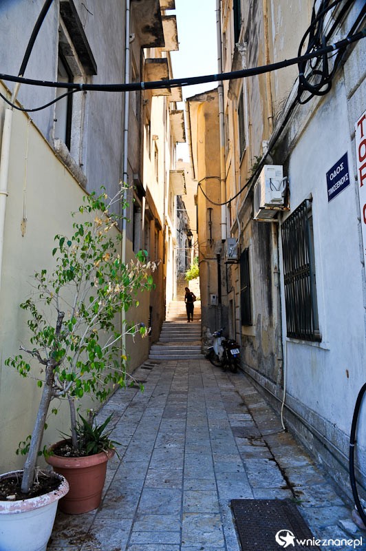 Grecka wyspa Korfu. Wąska uliczka w stolicy wyspy, Kerkirze.