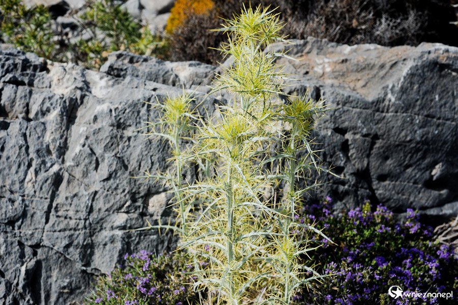 Wyspa Kreta. Roślina przy krętej drodze do Chora Sfakion. Suche górskie zbocza porasta m.in. fioletowo kwitnący tymianek.