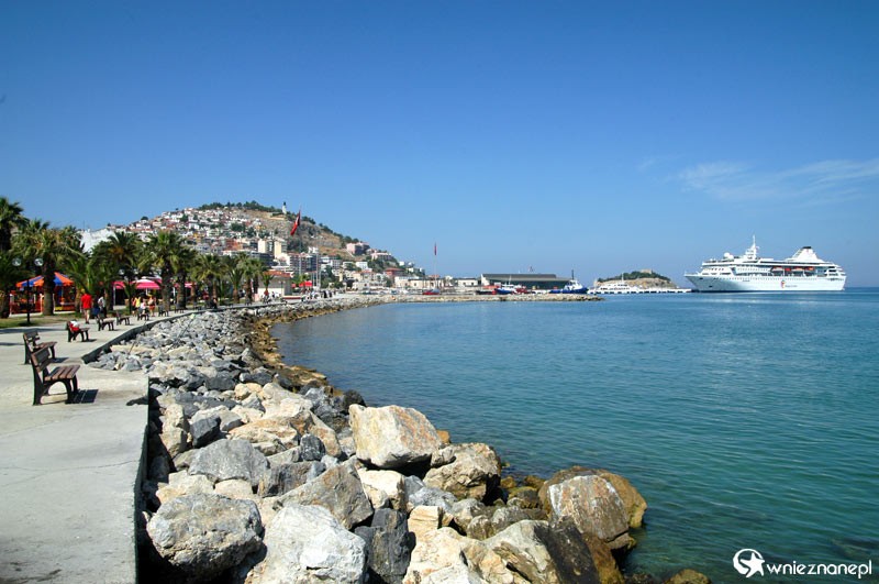 Nadmorski bulwar w mieście Kusadasi. W tle górujący nad miastem pomnik Ataturka oraz Pigeon Island.