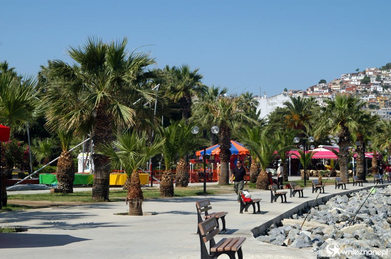 Nadmorski bulwar i palmy w mieście Kusadasi. Po prawej widać wędki.