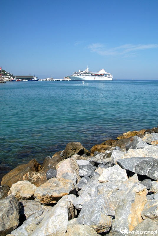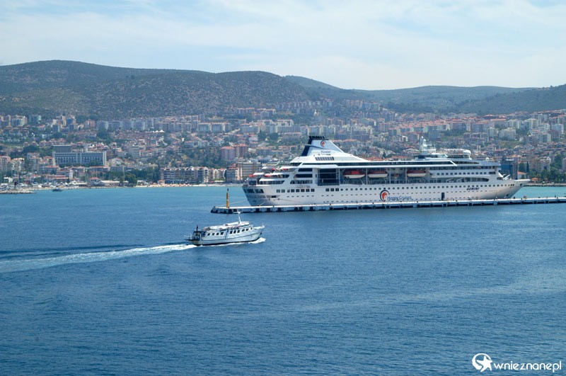 Pasażerowie wysiadający z ogromnego statku cumującego w porcie w mieście Kusadasi.