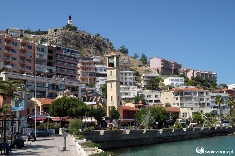Miasto Kusadasi. Widok na nadmorski bulwar, domy i wzgórze z pomnikiem Ataturka.