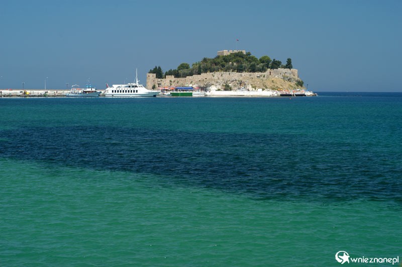Miasto Kusadasi. Słynna Pigeon Island (Ptasia Wyspa, Gołębia Wyspa) na tle pięknego koloru wody.