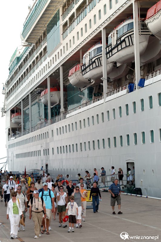Pasażerowie wysiadający z ogromnego statku cumującego w porcie w mieście Kusadasi.