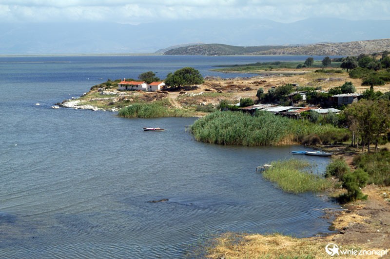 Wybrzeże Morza Egejskiego. Zamiast plaży kamienie i łódki rybackie.