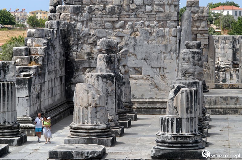 Didima. Ludzie spacerujący po ruinach dawnej świątyni Apollina na tle ogromnych kolumn.