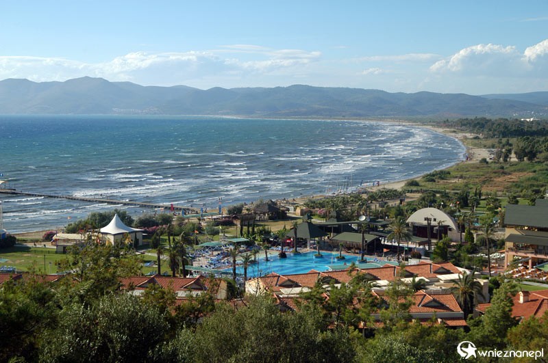 Okolice Kusadasi. Widok z góry na Morze Egejskie, hotele i góry w tle.