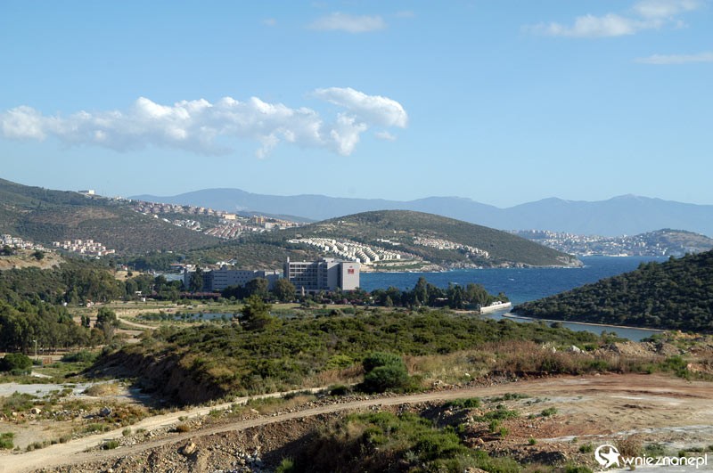 Okolice Kusadasi. Widok na zatokę, hotel i zabudowania mieszkalne na wzgórzach.