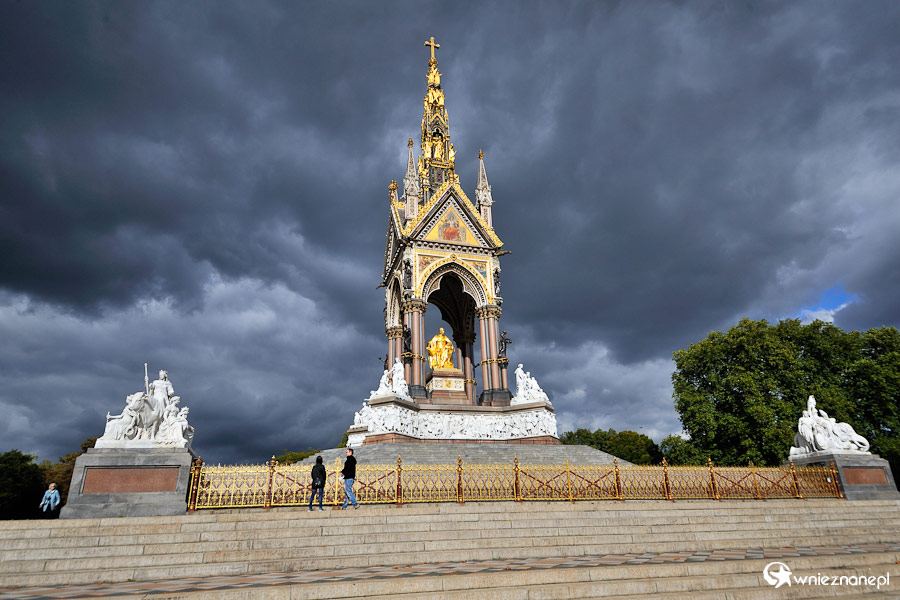 Londyn. Albert Memorial - wspaniały pomnik upamiętniający księcia Alberta, stojący na terenie Kensington Gardens. Za nim czarne chmury zwiastujące deszcz.