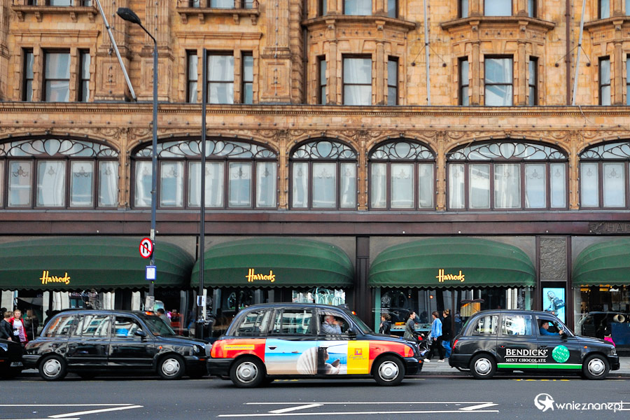Londyn. Taksówki przed najsłynniejszym domem towarowym - Harrods.