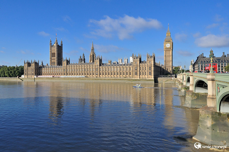 Londyn. Widok na Most Westminsterski, Parlament i Big Bena. W tle Opactwo Westminsterskie.