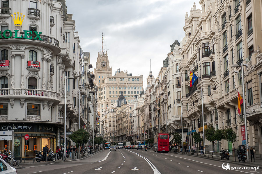 Madryt. Stylowe budynki przy słynnej Gran Via, najpopularniejszej ulicy Madrytu.