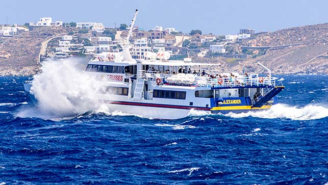 Po kilku godzinach wracamy na Mykonos. Przy 6 Bf i falach wysokości 2-3 m statkiem kołysze mocno. Nie da się stać, nie trzymając mocno obydwoma rękami, o czym boleśnie przekonała się jedna z pasażerek. Ci, którzy wybrali boczne ławki, narażeni byli na silne podmuchy wiatru i co i rusz wlewającą się na pokład wodę, przez co opuszczali statek kompletnie przemoczeni. Jeśli ktoś ma chorobę lokomocyjną, bez aviomarinu się nie obędzie. Można wcześniej sprawdzić prognozę falowania morza :). Dodatkowym atutem rejsu jest piękny widok na całą stolicę Mykonos - doskonale widać port, wiatraki i kościół Panagia Paraportiani. A jeśli nie na Delos, warto wybrać się choćby w rejs wzdłuż wybrzeża albo do jednej z plaż.