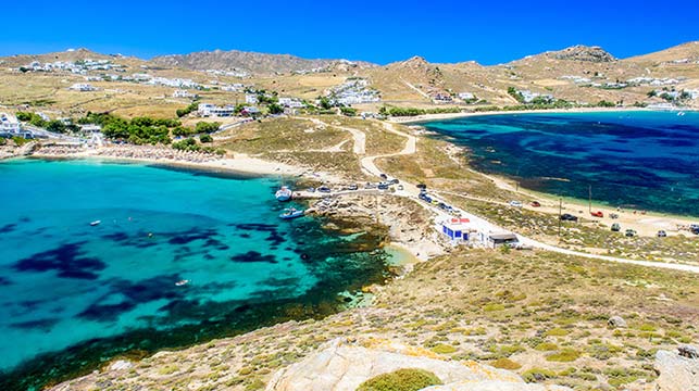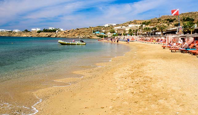 Niedaleko znajduje się kolejna z najchętniej odwiedzanych plaż - Psarou. Otaczają ją wzgórza, na których zbudowano ekskluzywne wille z prywatnymi basenami. Jest tu nawet lądowisko dla śmigłowców, a u wybrzeży cumują ekskluzywne jachty i statki wycieczkowe. Bogacze mogą skorzystać z wypożyczalni jachtów klasy vip. Kolejna z zatłoczonych południowych plaż to Platis Gialos. Także i ona jest dobrze zagospodarowana i ma zaplecze hotelowo-gastronomiczne.