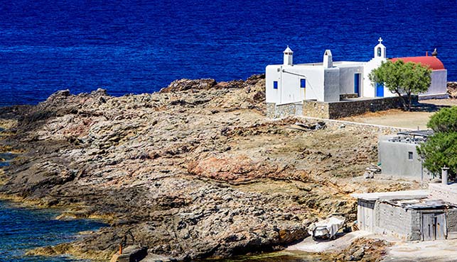 Położone na północnym-wschodzie plaże są odwiedzane głównie przez miejscowych. Żeby jednak móc powiedzieć, że zwiedziliśmy wyspę dokładnie, wybraliśmy się na plażę Merchia. Chociaż jest całkiem duża, zwykle raczej pusta. Częściowo zapewne przez ekspozycję na wiatr, częściowo przez brak infrastruktury. Do tego jest żwirowo-kamienista, podobnie jak wejście do wody. A że znajduje się daleko od stolicy, docierają tu nieliczni. Na wychodzącym w morze cyplu stoi kościółek Agios Nikolaos z obowiązkowym czerwonym dachem.