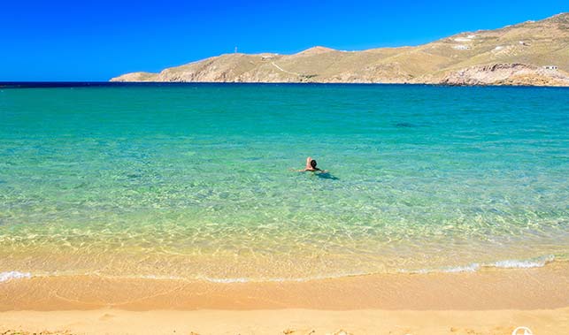 Zdecydowanie ciekawsza wydaje się położona dużo dalej na zachód plaża Panormos. Jest piaszczysta, z domieszką żwirku, zamknięta z obu stron niewielkimi wzgórzami i generalnie rzadziej odwiedzana przez turystów.
