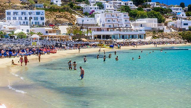 Jest też pomost, przy którym cumują łodzie wycieczkowe, i baza sportów wodnych, bary... cały dzień gra muzyka... Ogólnie - całkiem nieźle, jeśli się lubi tego rodzaju wypoczynek. Ale spodziewaliśmy się czegoś więcej, jakiegoś "wow". Niestety, niczego takiego tu nie było. Szybko pojechaliśmy więc w inne miejsce - na plażę Super Paradise. To właśnie tu odbywają się słynne całonocne imprezy, disco w pianie, gay party itp. Na plażę wchodzi się przez ogromny bar, przystosowany do przyjęcia prawdziwych tłumów. To też jedna z plaż, gdzie homoseksualistów dostrzega się najbardziej. O ile na większości plaż można spotkać takie pary, ale raczej w bocznych ich częściach albo w sposób nieafiszujący, tutaj będą ci, którzy swoją orientację demonstrują otwarcie i bywa, że w sposób skrajny.