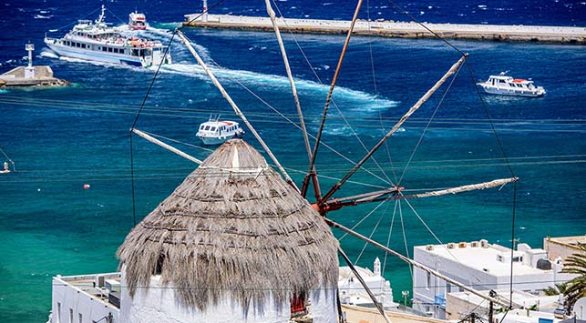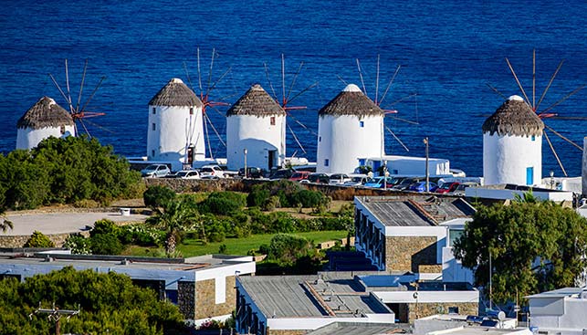 Jedną z głównych atrakcji wyspy są wiatraki. 7 tradycyjnych greckich wiatraków stoi na wzgórzu, powyżej zabudowań stolicy. U ich stóp rozciąga się fragment nabrzeża nazywany Little Venice, czyli Małą Wenecją. To popularne miejsce do obserwowania zachodu słońca. Trudno się dziwić, bo promienie zachodzącego słońca odbijają się od białych budynków, tworząc spektakularne widowisko. W jednym z wiatraków wieczorami odbywają się imprezy. Najlepiej przyjść tu rano, kiedy wiatraki oświetlone są przez słońce i... wieczorem lub po południu, kiedy światło pada na Little Venice.