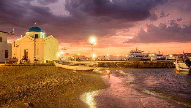Niedaleko stolicy znajduje się mała, ale bardzo ładna plaża Agios Stefanos. Jest piaszczysta, ma ratownika, a leżaki i parasole zajmują tylko niewielką jej część. Główny minus to położenie bezpośrednio przy drodze, ale za to widok cumujących nieopodal wielkich statków rekompensuje drobne niedogodności. Jako że port na Mykonos nie jest szczególnie duży, większość wielkich statków cumuje w zatoce, niedaleko brzegu. Od godzin porannych do późnej nocy pomiędzy nimi a portem kursują wodne taksówki przewożące pasażerów. Prawdę mówiąc, miejscowi nieszczególnie cieszą się z tego typu turystów, którzy zostawiają w odwiedzanych miejscach relatywnie mało pieniędzy, a najwięcej wydają na statkach. Podobny problem dotyczy zresztą innych miejsc, jak np. Wenecja, Santorini czy inne znane miasta portowe. Mimo wszystko, wycieczkowce na stałe wpisały się w panoramę Mykonos, a szczególnie fajnie wyglądają, gdy są podświetlone nocą.