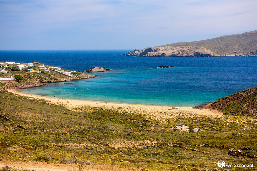 Mykonos. Piaszczysta plaża Agios Sostis w północnej części wyspy.